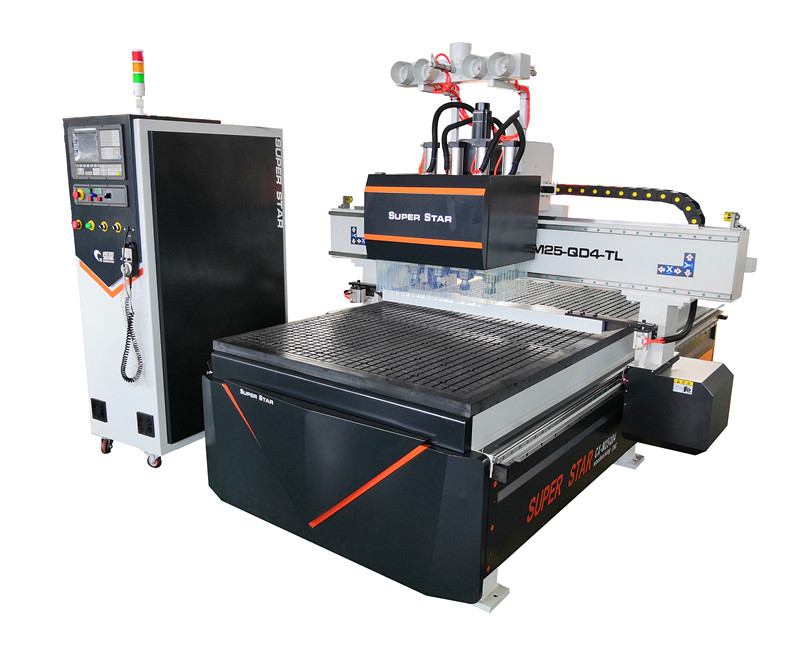 然后是木工加工中心,一般配置的是9kw風(fēng)冷主軸電機(jī),配有大容量刀庫,可裝夾多把不同用途的刀具,這款機(jī)型的優(yōu)點(diǎn)除了具備四工序櫥柜門開料機(jī)的所有功能之外,還具有針對(duì)于柜門做出多種花型雕刻的功能,當(dāng)你使用四工序櫥柜開料機(jī)時(shí),你最多也就是夾帶四種花型刀,而木工加工中心所攜帶的刀庫可以含帶8把刀,10把刀以及12把刀,目前選擇12把刀庫的客戶最多,主要是因?yàn)閮r(jià)格和配置10把刀或8把刀的刀庫價(jià)格差不了多少。