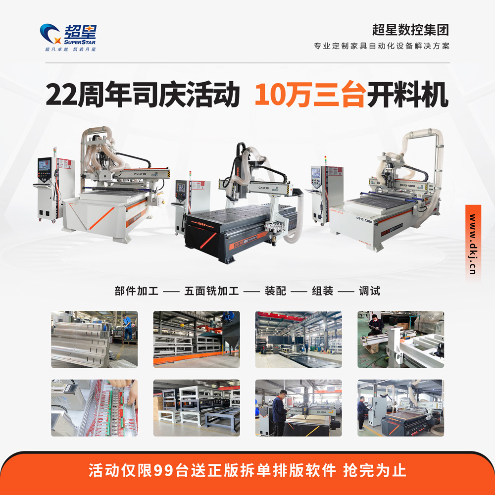 本次展會,我們超星數(shù)控將拿出看家本領(lǐng),準(zhǔn)備展示一系列前沿產(chǎn)品與創(chuàng)新技術(shù)。高速數(shù)控開料機(jī)龍門式門墻柜曲面四軸一體機(jī)將成為焦點(diǎn)之一,除了板材切割之外,還可以做曲木、門鎖孔、合頁孔的加工,其功能相較于傳統(tǒng)設(shè)備不僅有大幅提升,在保證高精度的同時,還能快速完成板材切割任務(wù),有效縮短生產(chǎn)周期,為全屋定制企業(yè)提高產(chǎn)能提供有力支持。直排換刀縱橫鋸加工中心也不甘示弱,在原有功能的基礎(chǔ)上做了改進(jìn)提升,直排配備縱橫切割鋸,加工效率大大提高,加工板材更加方便快捷。還有我們超星22周年紀(jì)念款0913直排換刀加工中心,活動推出99臺22周年0913款回饋新老客戶,以此感謝大家對我們超星數(shù)控的支持與信賴。
